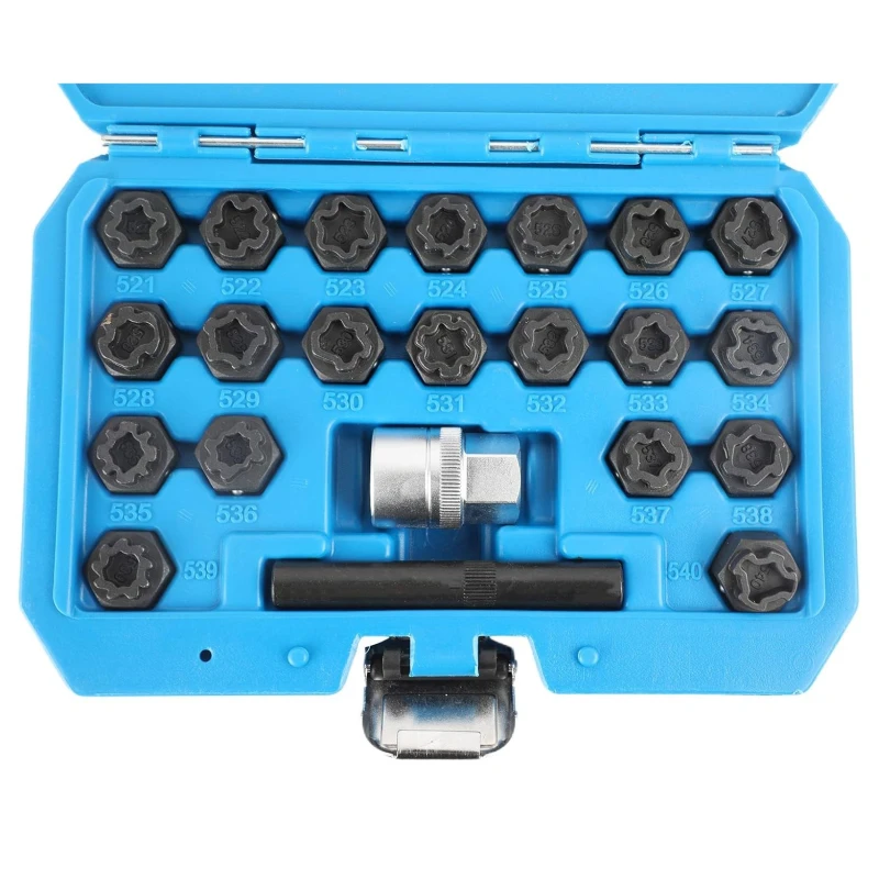 - Pilns komplekts: Ietver 20 atslēgas ar unikālām formām dažādiem uzgriežņiem, 1/2" (85mm) adapteri un izņemšanas instrumentu, kas atvieglo darbu darbnīcās un garāžās.