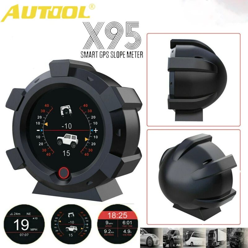 Autool X95 ir uzlabots instruments, kas paredzēts, lai precīzi mērītu bezceļu transportlīdzekļu un citu automašīnu šķērsenisko slīpumu, nogāzi un kāpuma vai krituma pakāpi. Aprīkots ar multiaxial giroskopu un integrētu GPS sistēmu, šī ierīce sniedz pilnīgu informāciju par transportlīdzekļa ātrumu, augstumu, virzienu un pozīciju, kā arī reāllaika pulksteni ar augstu satelīta precizitāti.