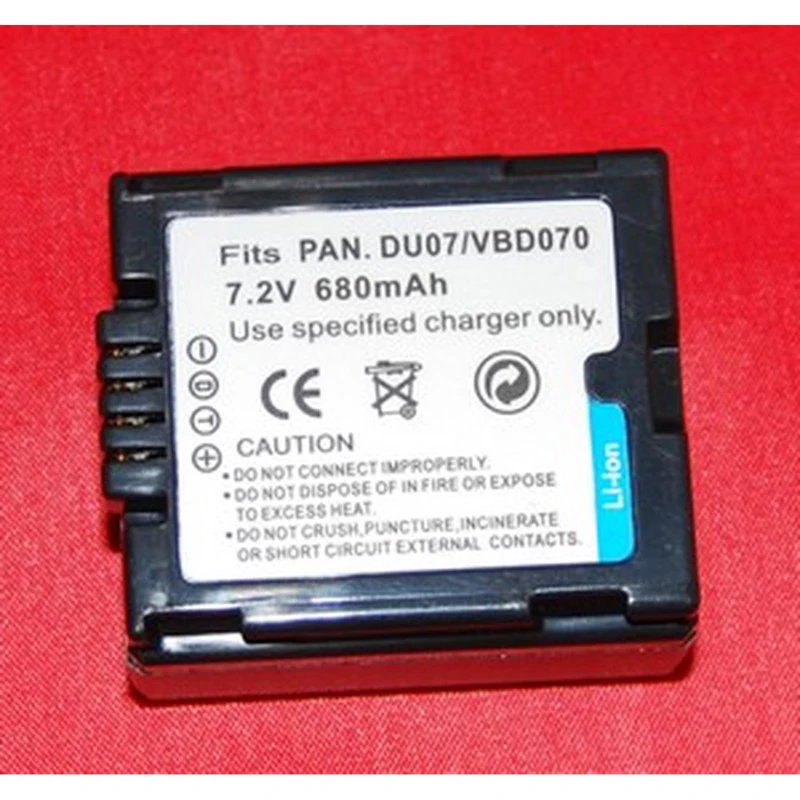 Panasonic Du07/Vbd070 saderīgās baterijas tipiskie izmēri ir aptuveni 48 mm × 32 mm × 10 mm, un svars ir ap 50 g. Komplektā ir tikai baterija, bez lādētāja un papildu piederumiem.