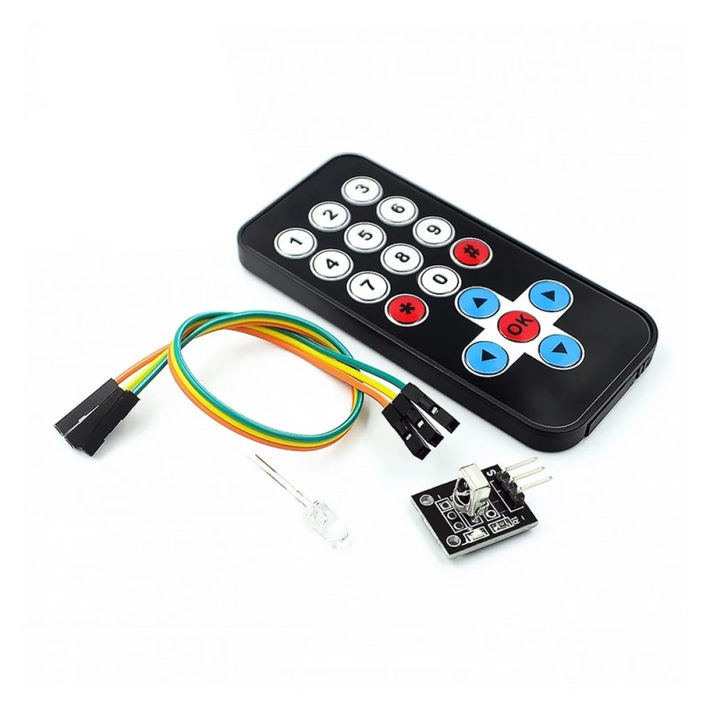 Arduino infrasarkano tālvadības komplekts ir kompakts un efektīvs risinājums tiem, kas vēlas savos Arduino, AVR vai PIC projektos integrēt bezvadu tālvadību. Šis komplekts sastāv no plānas pults ar 20 funkcionālām pogām un IR uztvērēja moduļa, kas darbojas standarta 38kHz frekvencē un ir saderīgs ar lielāko daļu infrasarkanās tālvadības lietojumu.