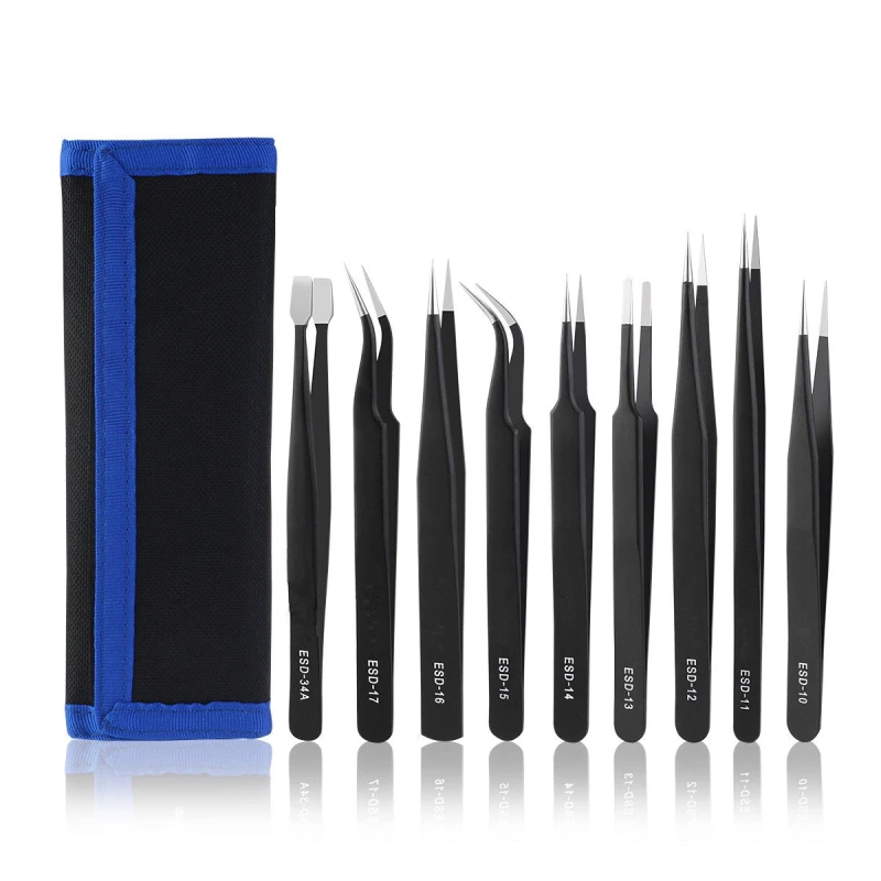 Šis komplekts nodrošina ESD aizsardzību, kas to atšķir no parastām pincetēm, jo palīdz novērst statiskās elektrības radītus bojājumus. Turklāt nerūsējošā tērauda konstrukcija nodrošina izturību pret koroziju un lielāku ilgmūžību salīdzinājumā ar oglekļa tērauda vai zemākas kvalitātes materiāliem, kas var ātrāk zaudēt precizitāti un rūsēt.